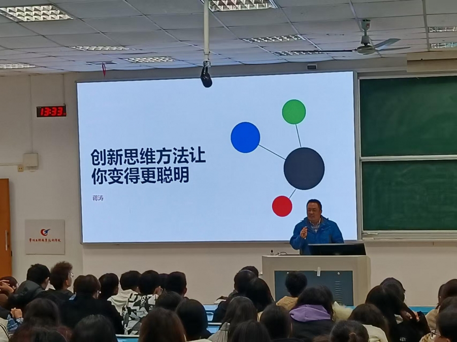 讲座中,蒋老师深入浅出地阐述了创新思维方法的重要性及其在实际应用中的价值。从科技创新和AI人工智能发展的背景引入,鼓励同学们积极参加科技竞赛、社团活动、社会实践等课外活动和专业老师的双创项目实践,打破学科专业界限、拓宽知识视野、从日常学习,实验实训中培养创新思维、培养综合素质。他首先介绍了TRIZ理论中的功能定义,强调了准确理解产品或系统功能的关键意义,这是进行创新设计的基础。接着,他详细讲解了功能的分类,将功能分为主要功能、辅助功能和附加功能等,使学生对功能的多样性有了更清晰的认识。在功能应用场合方面,蒋老师通过丰富的实例,展示了创新思维方法在各个领域的广泛应用,包括工业制造、科技研发、日常生活等,让同学们深刻体会到创新思维的无处不在。随后,蒋老师深入讲解了产品(系统)组件拆分的方法和技巧。他指出,通过合理地拆分组件,可以更好地理解产品的结构和功能。在此基础上,编制组件功能列表,能够更加系统地分析每个组件的作用。同时,他还分析了组件之间的关系,包括相互依赖、相互制约等,为构建功能模型图奠定了基础。接着,蒋老师通过构建功能模型图,将产品(系统)的功能、组件以及它们之间的关系以直观的图形方式呈现出来,使复杂的系统变得清晰易懂。